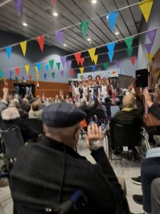 Las trabajadoras bailando con ella, la gente levantando las manos, sonriendo, cantando…