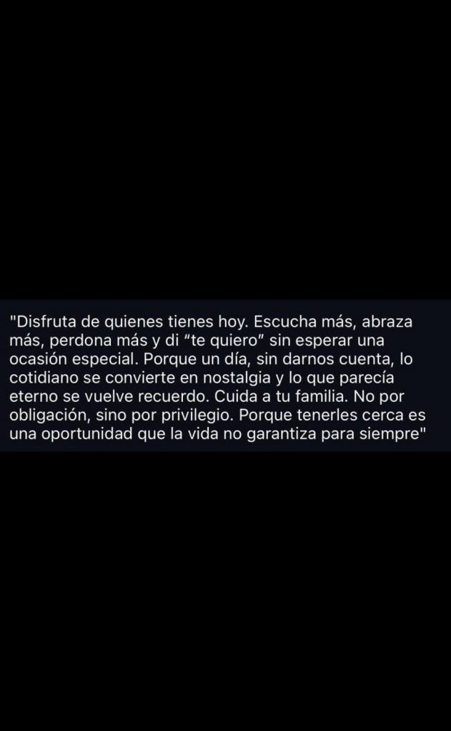 “Disfruta de quienes tienes hoy. Escucha más, abraza más, perdona más y di ‘te quiero’ sin esperar una ocasión especial. Porque un día, sin darnos cuenta, lo cotidiano se convierte en nostalgia y lo que parecía eterno se vuelve recuerdo. Cuida a tu familia. No por obligación, sino por privilegio. Porque tenerles cerca es una oportunidad que la vida no garantiza para siempre.”